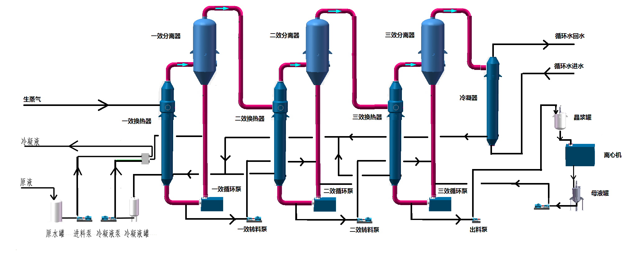 多效蒸發(fā)器是由相互串聯(lián)的多個蒸發(fā)器組成,飽和加熱蒸汽被引入第一效,加熱其中的廢液,產生的蒸汽被引入第二效作為加熱蒸汽,使第二效的廢液以比第一效更低的溫度蒸發(fā),這個過程一直重復到末效。第一效凝水返回熱源處,其他各效凝水匯集后作為淡水輸出,一份蒸汽投入,可以蒸發(fā)出多倍的水出來。同時,高鹽廢水經(jīng)過由第一效到末效的依次濃縮,在末效達到飽和而結晶析出,由此實現(xiàn)鹽分與廢水的固液分離