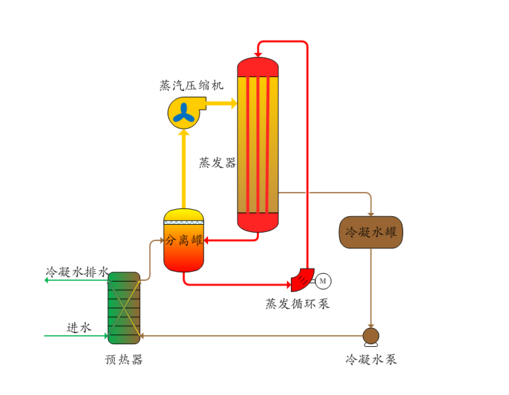 所謂的機械蒸汽再壓縮循環(huán)蒸發(fā)技術,是根據(jù)物理學的原理,等量的物質,從液態(tài)轉變?yōu)闅鈶B(tài)的過程中,需要吸收定量的熱能。當物質再由氣態(tài)轉為液態(tài)時,會放出等量的熱能。