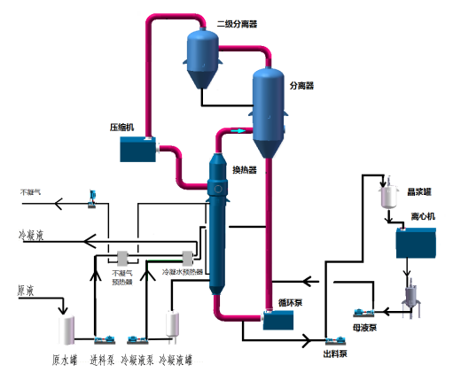 3、冷凝回收:蒸發(fā)產(chǎn)生的二次蒸汽被送入壓縮機(jī)進(jìn)行壓縮和升溫后,再次打入加熱器進(jìn)行循環(huán)利用。同時(shí),冷凝后的水分被收集起來(lái)進(jìn)行后續(xù)處理或回用。