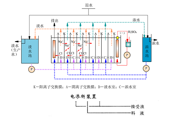 陰膜只讓陰離子穿過;陽膜只讓陽離子穿過。如圖所示,在直流電場的作用下,Na+離子向陰極移動,Cl-離子向陽極移動。又由于離子交換膜的選擇透過性,使Cl-離子只能透過陰離子交換膜、Na+離子只能透過陽離子交換膜。在Cl-離子和Na+離子都遷出的隔室為淡化室簡稱為淡室,Cl-離子和Na+離子都遷入的隔室為濃縮室簡稱為濃室。分別將各濃、淡隔室的水流匯聚引出,便產(chǎn)生兩股主水流,脫鹽水和濃縮鹽水。